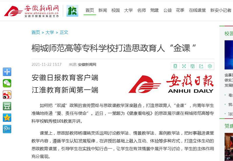 安徽新聞網:《桐城師範高等專科學校打造思政育人“金課”》