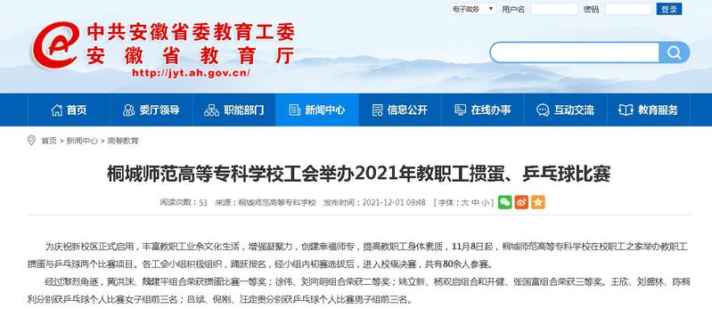 安徽教育網:《桐城師範高等專科學校工會舉辦2021年教職工摜蛋、乒乓球比賽》