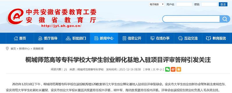 安徽教育網:《桐城師範高等專科學校大學生創業孵化基地入駐項目評審答辯引發關注》