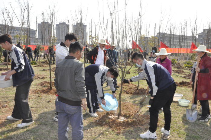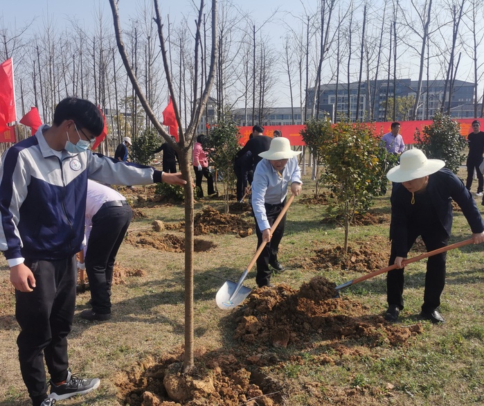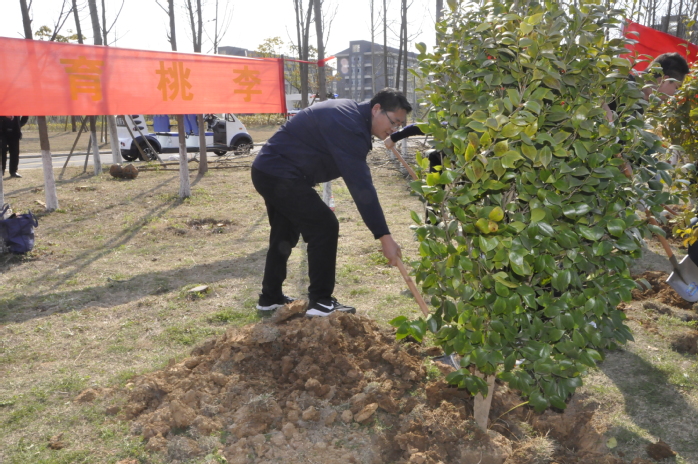 植樹現場,春風和暢,春意濃濃,一片忙碌景象。大家佩戴口罩,相對分散植樹,揮鍬鏟土、扶直苗木、培實新土、提桶澆水,三兩人通力合作,認真地完成著每一道植樹工序,合力種下了百餘棵紅葉李、茶花、櫻花、枇杷等苗木。在師生共同努力下,短短一個小時,單樹成行,單行成林,一株株新綠昂然挺立,一顆顆新苗紮根新校區,迎風舒展,在和煦的春風中煥發出勃勃生機。