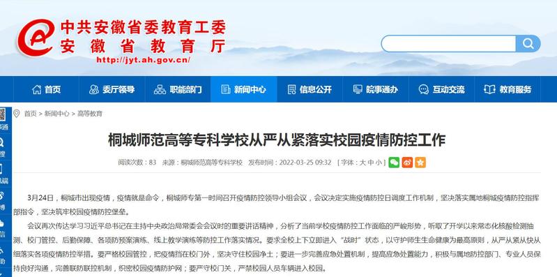 安徽教育網:《桐城師範高等專科學校從嚴從緊落實校園疫情防控工作》