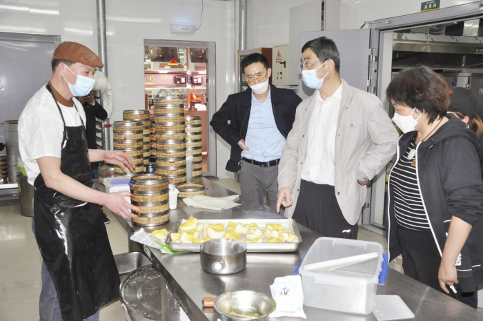 一走進食堂,沈波就來到前來就餐的同學們中間,詢問菜品的口感和價格,聽取同學們對食堂滿意度的意見和建議。沈波還走進後廚,詳細了解食堂菜品加工、麵點加工、烹飪操作間、售飯間等各個加工環節的衛生管理情況,對食堂加工環境衛生、餐具消毒、原材料儲存、食品留樣、采購和燃氣設備的規範使用等安全管理方麵工作落實情況進行了檢查。沈波叮囑食堂要落實好一周兩次的全員核酸檢測,工作中戴好口罩,遵守操作規程,注意用火用電用氣的安全。沈波還深入食堂冷庫,打開包裝箱,查看庫存食品批號、保質期等情況。沈波指出,當前全國各地疫情形勢嚴峻,學校疫情防控麵臨巨大挑戰,食堂要密切關注疫情形勢,采取積極有效應對舉措,重點做好物資儲備,尤其注意多儲存一些肉製食品,切實做好疫情期間的保供工作。