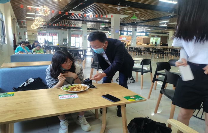 在學生食堂,吳登明詢問正在就餐的同學們對食堂飯菜質量、價格和衛生狀況的意見建議,現場檢查了食堂的食品儲藏、餐具清洗消毒、員工服務操作規範、食堂內外環境消毒環節等工作;吳登明還仔細檢查了超市售賣的食品質量、保質期。