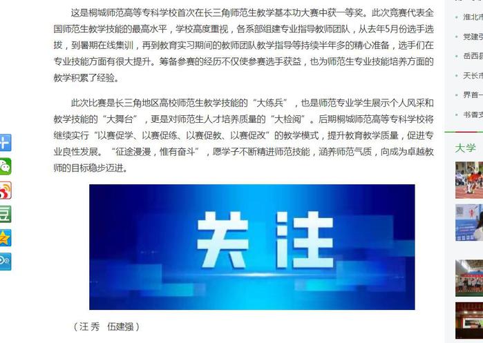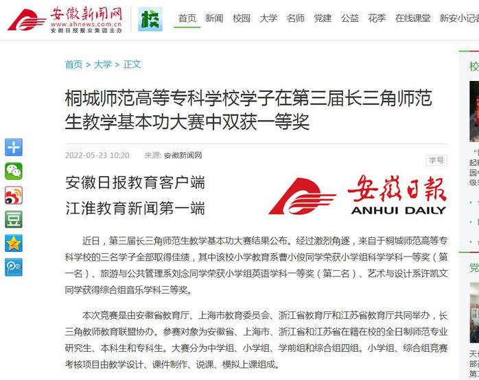 安徽新聞網:《桐城師範高等專科學校學子在第三屆長三角師範生教學基本功大賽中雙獲一等獎》