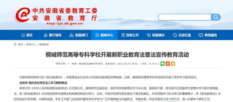安徽教育網:《桐城師範高等專科學校開展新職業教育法普法宣傳教育活動》