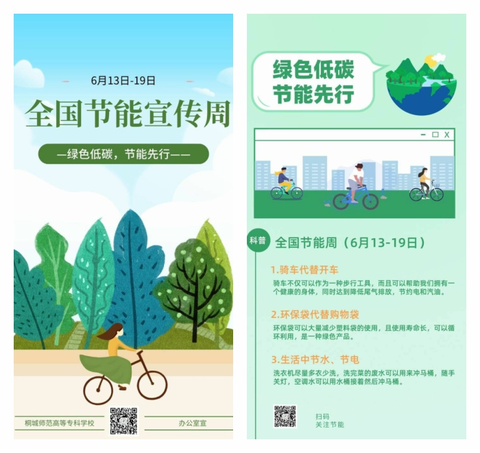 6月13日至6月19日為全國節能宣傳周,6月15日為全國低碳日。桐城師範高等專科學校以“綠色低碳,節能先行”為主題,在全校範圍內多渠道、多部門聯動開展了開展節能宣傳周活動,提升師生節能意識和節能能力,進一步推進綠色校園建設,打造節約型校園。