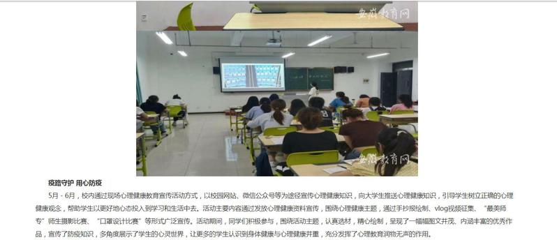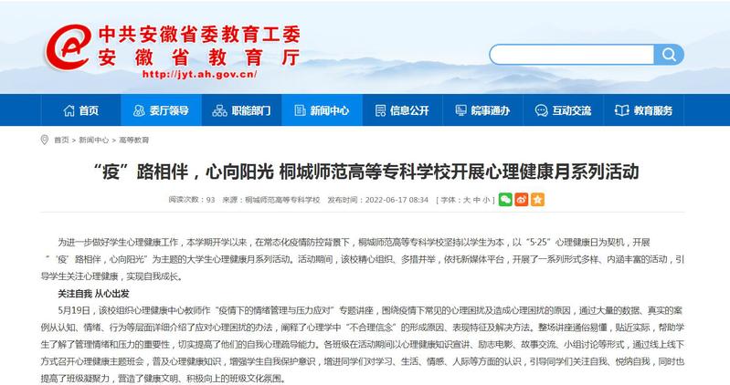 安徽教育網:《“疫”路相伴,心向陽光 桐城師範高等專科學校開展心理健康月係列活動》