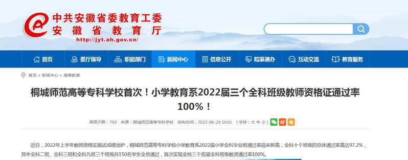 安徽教育網:《桐城師範高等專科學校首次!小學教育係2022屆三個全科班級教師資格證通過率100%!》