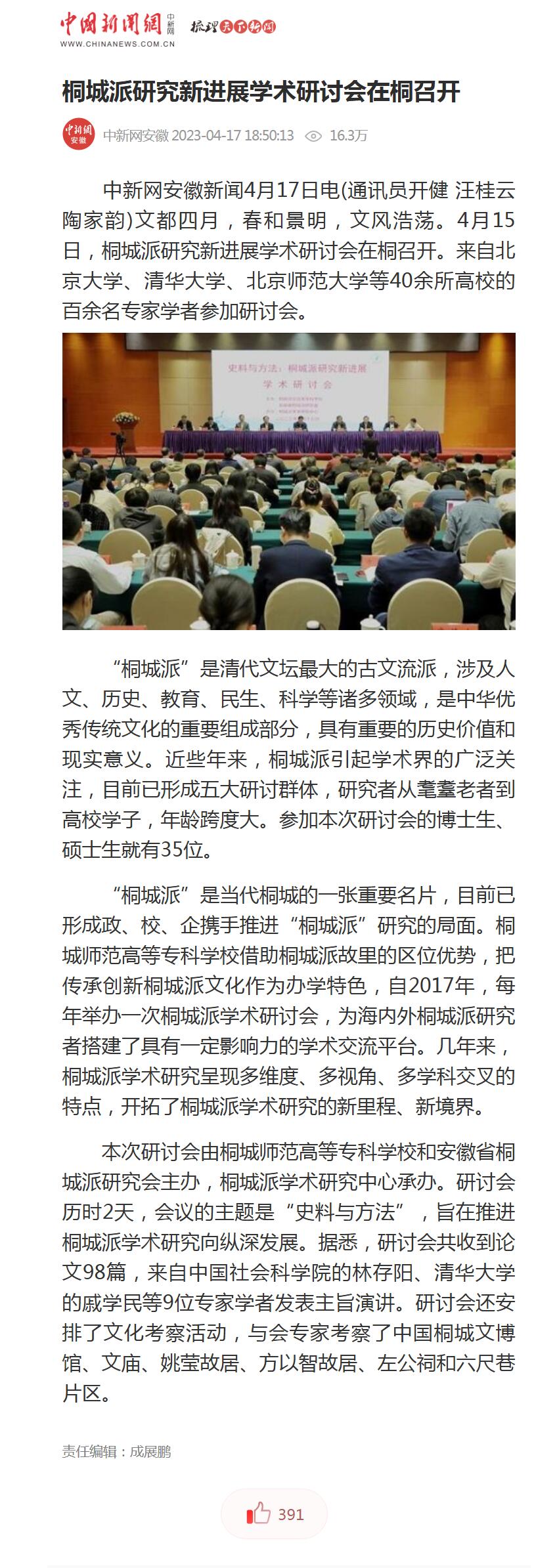 中國新聞網:桐城派研究新進展學術研討會在桐召開