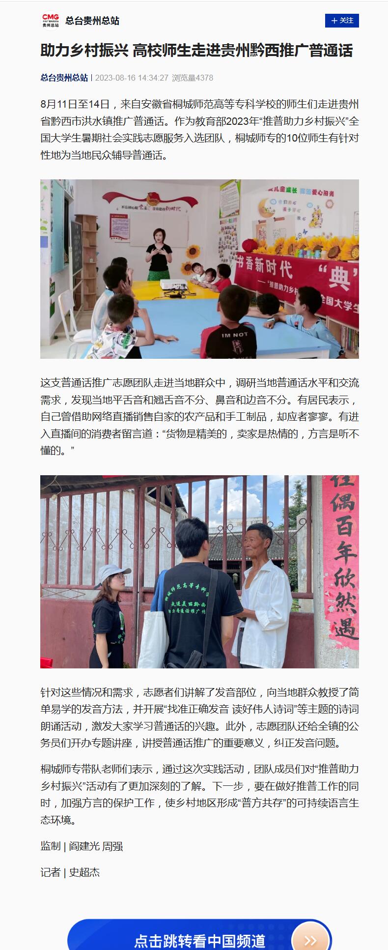 央視新聞:助力鄉村振興 高校師生走進貴州黔西推廣普通話