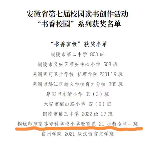 在剛落幕的安徽省第七屆校園讀書創作活動評選中,學校21級小學教育全科1班獲“書香班級”榮譽稱號。