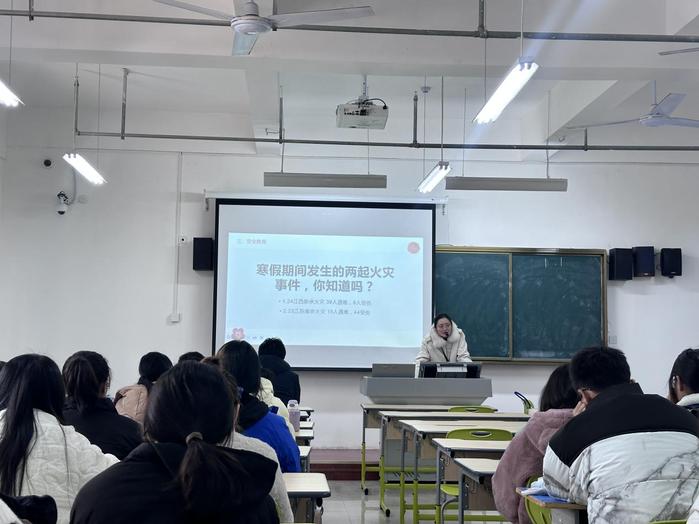 3月5日至3月19日,各係輔導員深入學生宿舍進行安全排查,重點對違章電器、私拉私接電線、違規占用安全出口等宿舍安全隱患情況進行逐層逐間檢查。針對個別存在安全隱患的學生宿舍,對學生進行安全教育並提出整改意見,要求同學們嚴格遵守寢室相關管理規定,確保消除安全隱患,共同維護安全、衛生的宿舍環境。在安全排查的同時,輔導員們耐心向同學們傳達了預防火災的重要性,提醒同學們安全用電,並鼓勵同學們利用課餘時間學會使用滅火器。學生宿舍安全排查後,輔導員們陸續開展“師生有情火無情 校園防火鍾長鳴”消防安全主題班會,輔導員運用豐富的生活事例,配合圖片、數據、文字以及相關真實案例,深入淺出地向同學們普及了消防安全知識,希望同學們引以為戒,防患於未“燃”。