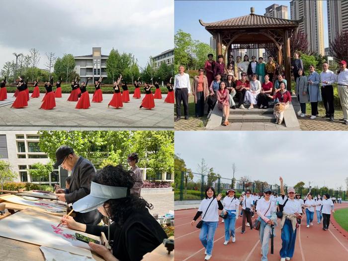 芳菲四月,春風駘蕩,春光正濃。老年大學各班級把教室設在校園,廣泛開展人與自然和諧相融的第二課堂教學活動。合唱班學員們在校園漫步行吟,沐浴著春風深情歌唱,給美麗校園塗抹了一道更加豔麗的色彩;國畫班學員在老師的帶領下來到戶外采風寫生,在大自然中尋找創造靈感,自然與藝術之美相映成趣;舞蹈班學員以音樂北樓花壇為背景展示教學活動,引來許許多多學生駐足欣賞。老年大學學員熱情參加第三屆師生校園健步走活動,在運動場上展示出了別樣的青春風采。