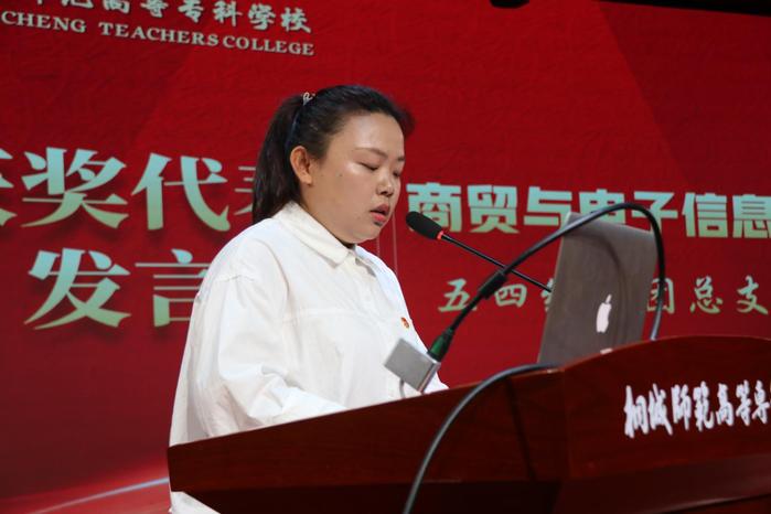 大會在雄偉莊嚴的國歌中拉開序幕。校團委書記汪若冰宣讀了“五四”表彰決定,校領導為各項獲獎代表頒獎。五四紅旗團總支獲得者代表商貿與電子信息係團總支書記胡豔豔,優秀學生幹部獲得者代表葉娟娟同學依次上台發言,結合自身工作經曆,交流體悟。說明:IMG_7304