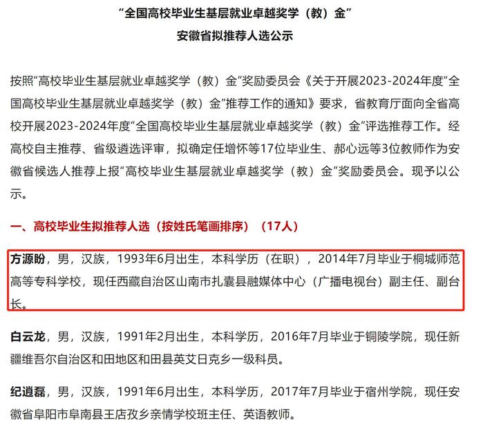 近日,安徽省教育廳公布了2023-2024年度“全國高校畢業生基層就業卓越獎(教)金”安徽省擬推薦人選名單,我校畢業生2014屆畢業生方源盼基層就業事跡成功入選。