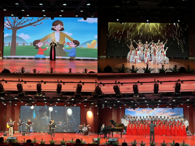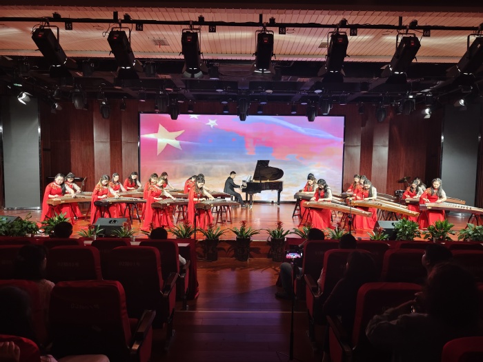 音樂會在一曲悠長高亢、激昂有力的古箏合奏《黃河》中拉開序幕,隨後在主持人熱情洋溢的介紹中,舞蹈、鋼琴四手聯彈、獨唱、小合唱、器樂合奏、大合唱等多種藝術表演形式悉數登場。