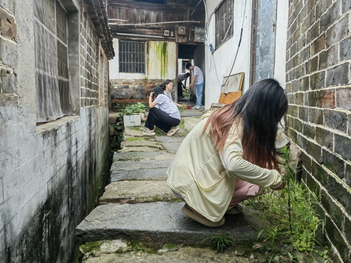 四、體驗一次誌願者,做環保理念的衛士。唐灣村有明清、民國時期建立保留下來的古民居群。該群四麵環山,依地勢由低向高逐層構築,磚木結構,弄廊縱橫交錯,迂回有致,古民居群是唐灣村曆史文化積澱的見證,也是先民生活智慧的結晶。由於前期雨季,民居內雜草層生,實踐團隊分工協助把雜草全部清除,保持民居內的幹淨整潔衛生。