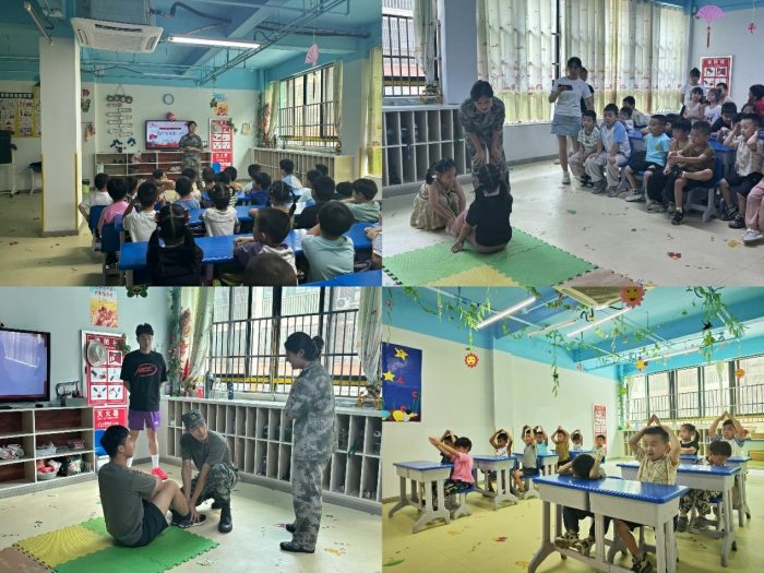 宣講員潘丹丹和方勇圍繞其軍旅生涯的寶貴經曆,為小朋友們帶來了一次別開生麵的軍旅故事分享會。從艱苦訓練的汗水到執行任務時的勇敢無畏,從戰友間的深厚情誼到對國家的無限忠誠,每一個故事都深深觸動了在場每一個人的心。隨後,根據幼兒特點,潘丹丹精心準備了一套簡單易懂、富有節奏感的國防手語操教授給小朋友們。孩子們認真模仿每一個手勢,雖然動作略顯生澀,但那份專注與熱情卻讓人十分動容。