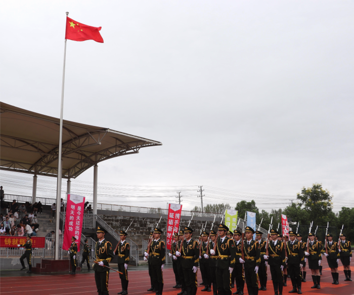 大會伊始,國旗護衛隊邁著鏗鏘有力的步伐,護送國旗來到升旗台前,伴隨著莊嚴的國歌聲,近2000名新生齊聚田徑場,滿懷憧憬地迎接大學生活的第一課。