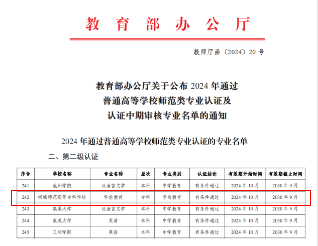 近日,教育部正式發布了《教育部辦公廳關於公布2024年通過普通高等學校師範類專業認證及認證中期審核專業名單的通知》(教師廳函〔2024〕20號),我校學前教育專業順利通過普通高等學校師範類專業第二級認證,認證結論為“通過認證,有效期6年(有條件)”,自2024年10月起至2030年9月止。我校學前教育專業作為打樣專業,是安徽省高職高專第一個,也是唯一一個通過教育部師範專業認證的專業。