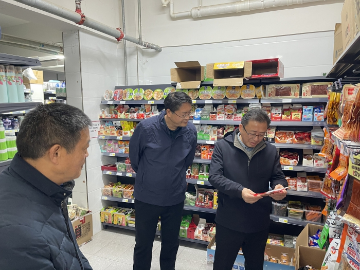 隨後,王子龍一行前往快遞驛站、超市、食堂等場所進行實地查看,對環境衛生、安全製度、食品原料質量、食品進貨台賬及食品儲存等進行了全麵而細致的檢查。
