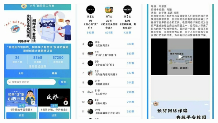 大賽采用網絡大眾投票與線下評委打分相結合的方式進行。網絡投票環節吸引了廣大師生和家長的關注與參與,36份參賽作品累計收獲高達8368票,瀏覽量突破36820人次,在全體師生中掀起來一股反詐防騙宣傳熱潮。線下評審組由學校相關部門負責人、輔導員代表和學生代表共9人組成,從內容主題、製作技術、表演效果和社會價值等四個方麵,全麵考量作品的反詐宣傳效果、創意構思、製作質量以及社會影響力。經過激烈角逐,大賽最終評選出了一等獎4名、二等獎7名、三等獎11名和優秀獎若幹名,並根據網絡投票數評出“網絡最佳人氣獎”10名。說明:c33b62011ba73335139ccbcf698fac4 說明:fdb06fdf8a36f52c708289953f50b25 說明:15b81941c8e04013c0e692e9252fbb6