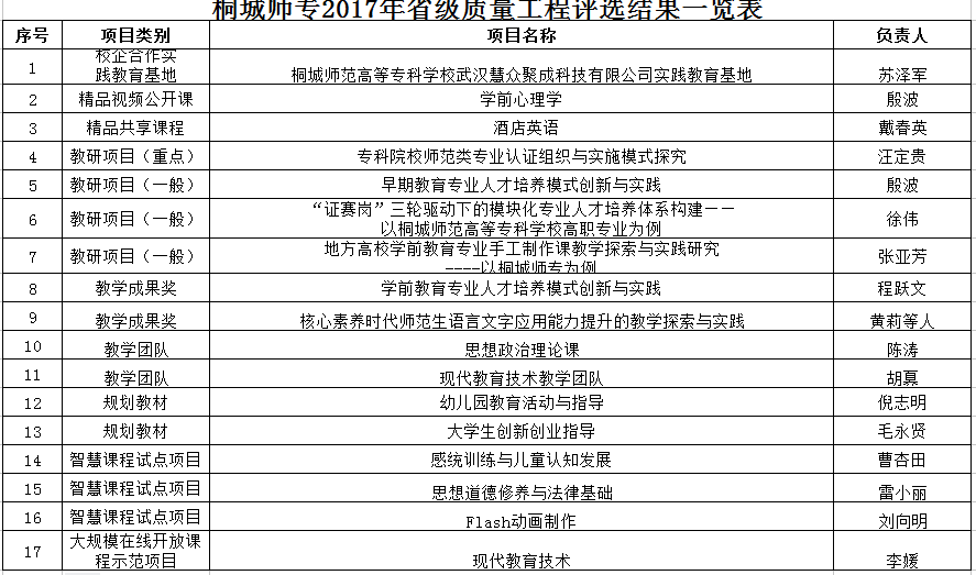 根據安徽省教育廳《關於做好2017年度高等學校省級質量工程申報工作的通知》(皖教秘高【2017】188號)文件精神,經個人申報、係(處)推薦、學校組織專家評審,擬推薦2017年省級質量工程項目已評選完畢,現予以公示(見附表)。公示期內,如有異議可向校監察審計處和教務處反映。