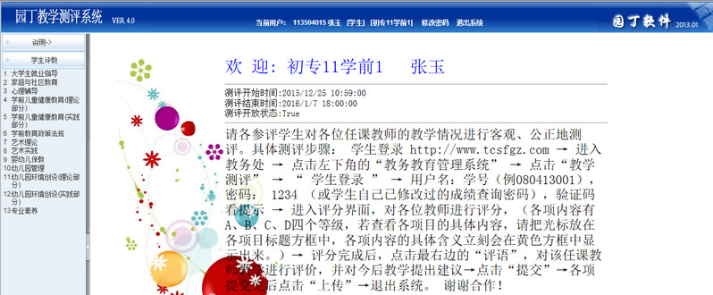 二、點擊 “教學質量測評”,輸入用戶名和密碼(初次登錄者用戶名為學號,密碼為1234;為保障信息安全,請及時修改密碼,遺忘密碼者請與所在係部教學秘書聯係),點出現如下界麵:
