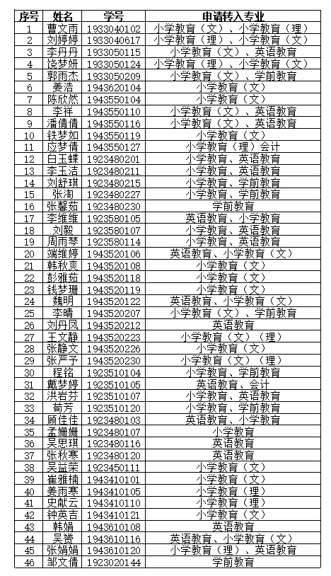 根據《桐城師範高等專科學校學生轉專業管理辦法》規定,經學生個人申請、係部初審、學校組織筆試,按轉專業筆試成績、期末總評、班級排名等綜合考察,現將2019級轉專業學生名單予以公示。校監察審計處全程參與此次工作。