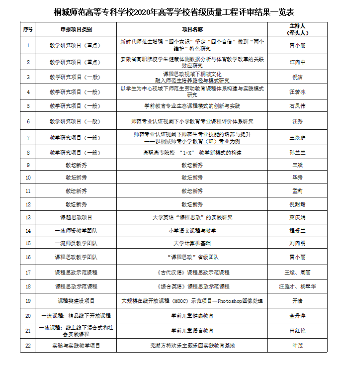 根據《關於做好2020年度高校省級質量工程項目申報工作的通知》(桐師專教字[2020]19號)文件精神,經個人申報、係處推薦、專家評審、學校審核,2020年度校級質量工程項目評審工作順利結束,現將評審結果予以公示(見附表)。