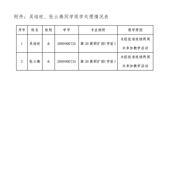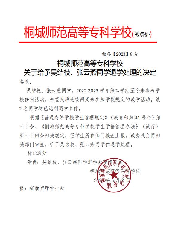 教務【2023】8號 桐城師範高等專科學校關於給予吳結枝等同學退學處理的決定