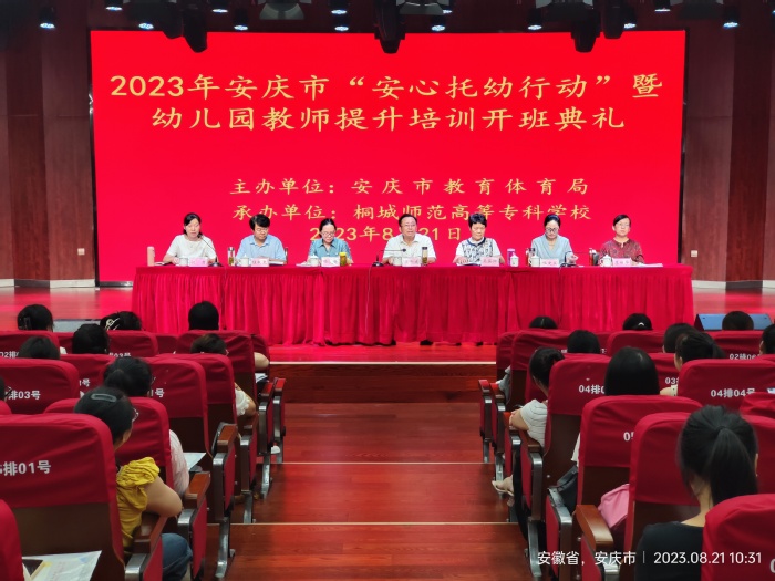 為落實安徽省、安慶市暖民心行動工作部署推進會精神和安慶市《十四五學前教育發展提升行動計劃》,加強幼兒教師隊伍建設,提升幼兒教師業務素質。8月21日,由安慶市教育體育局主辦,桐城師範高等專科學校承辦的2023年安慶市“安心托幼行動”暨幼兒園教師提升培訓會開班典禮在桐城師專演藝廳舉行。