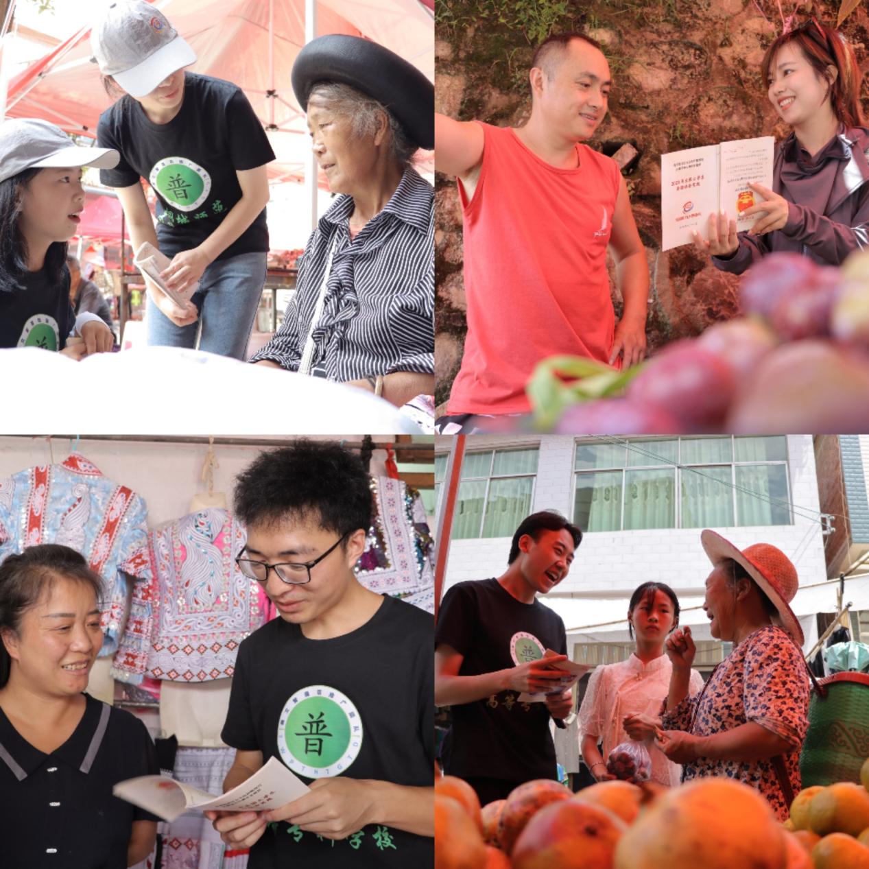 蘭風初醒的夏日清晨,黔西鄉村的小路蜿蜒如帶,遠處雲白風清,群山青綠似黛,水天一色,上下空明,炊煙隔江而起,嫋嫋於斑駁的陌上;田園裏是成熟的瓜果,農人明媚的笑臉。10日上午,團隊成員深入本次活動的第一站黔西市新仁苗族鄉進行推普宣傳,正值每周一次的集會,鄉村街道車水馬龍人群攢動,隊員們有針對性地選擇一些老人、婦女和兒童進行了隨機調查,並發放了普通話宣傳冊。