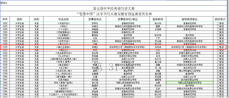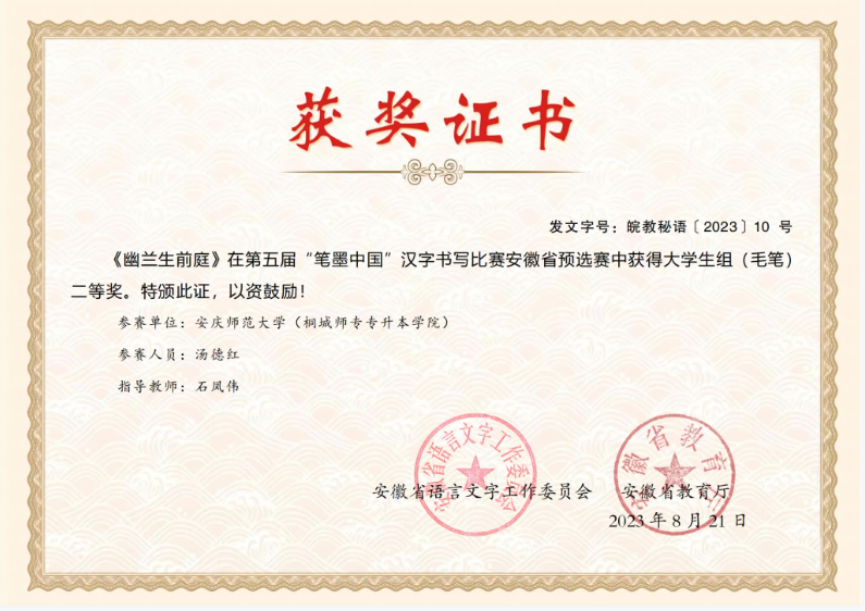 6月初,我校與安慶師範大學聯合培養的22級學前教育本科班湯德紅同學參加了安慶師範大學中華經典誦寫講大賽校賽選拔,取得校賽毛筆項目一等獎的好成績。7月初,湯德紅的作品《幽蘭生前庭》由安慶師範大學選送參加安徽省預選賽的大學生組毛筆項目,並獲得了省賽二等獎的優異成績。