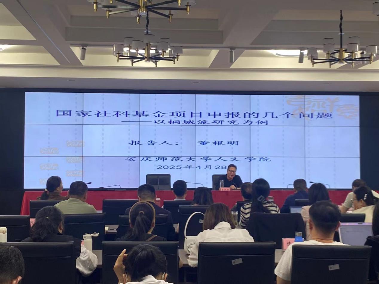 會上,董根明教授結合自身成功申報國家社科基金項目的經驗,作了題為《國家社科基金項目申報的幾個問題——以桐城派研究為例》的專題講座,係統剖析了項目申報的關鍵環節。他從桐城派研究迎來曆史性機遇切入,強調選題需立足學術前沿,同時體現地域文化特色,並詳細解讀了申報書撰寫的核心要素,包括選題依據、研究內容、創新之處、預期成果及參考文獻等模塊的撰寫技巧和注意事項,分享了如何通過文獻綜述體現學術積澱,如何設計合理的預期成果以提升項目競爭力等。董教授指出,做科研重在積累,要凝練學術團隊,聚焦核心問題,久久為功。在互動環節,董根明教授針對老師們提出的教學、科研及項目申報等方麵的問題,一一進行解答。