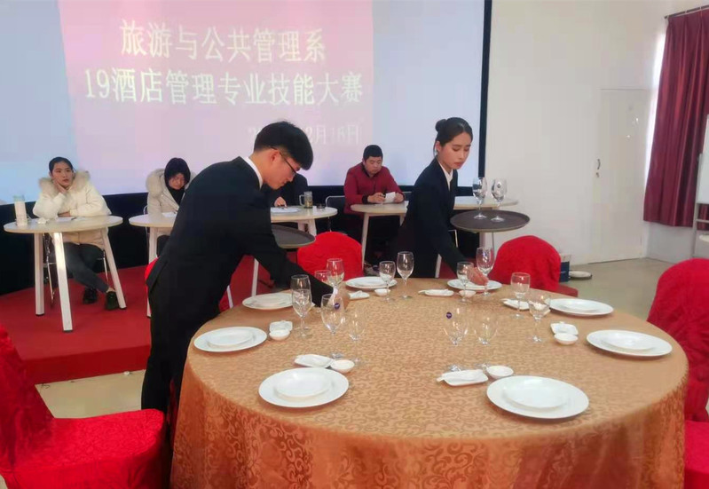酒店管理專業技能考核包含在中餐宴會設計與擺台、英文情景對話、禮儀展示三項。競賽中,同學們發揮想象,以全新的視角進行了中餐主題設計,同時配合中餐主題展示了規範優雅的席間服務。