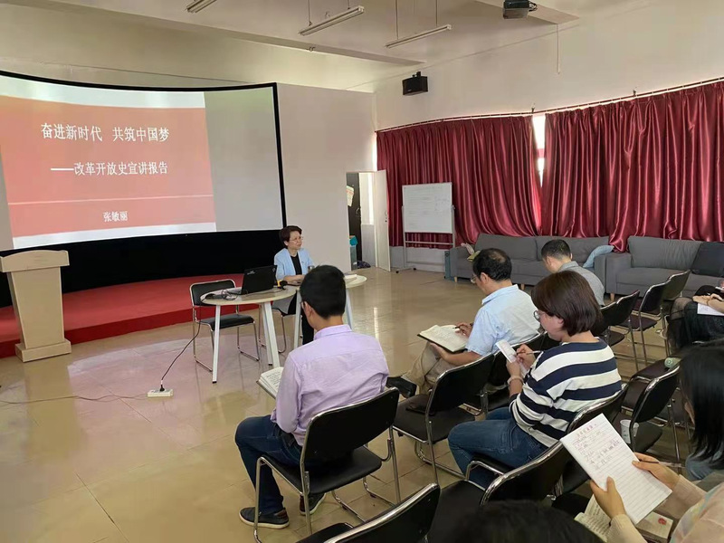 張敏麗書記以《奮進新時代共築中國夢——改革開放史宣講報告》為黨課主題,圍繞改革開放的重大意義以及改革開放以來中國在發展中國特色社會主義道路上所取得的的一係列成就,從四點展開講述:一、實現偉大曆史轉折;二、開創中國特色社會主義道路;三、中國特色社會主義進入新時代;四、改革開放以來我國高等職業教育、師範教育的發展。張書記專業的眼光,透徹的分析,生動的講解,進一步加深了在座師生對黨史學習教育以及改革開放史的深入理解,達到了良好的學習效果,贏得了大家的陣陣掌聲。