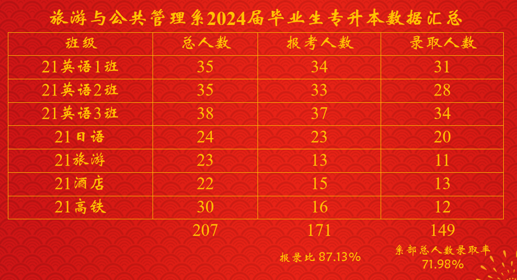 2024屆畢業生專升本錄取工作已經結束,旅管係再傳捷報。在207位畢業生中,報考專升本170人,錄取148人,通過率高達87%,全係平均通過率72%,超過全省平均數,再次刷新我係專升本記錄。