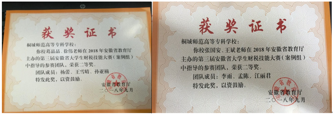 近期,安徽省教育廳公示了2018年省大學生財稅大賽(案例組)的成績,我係選手楊蕾等6人組成的兩支代表隊均獲得二等獎,這也是我校在該項賽事上的最好成績,在我係技能比賽的係列翻身仗中再次響起勝利的號角,徹底摘掉了技能比賽的弱者“帽子”,充分展示近年來我係非師範專業建設發展的豐碩成果。