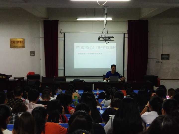 為了讓學生盡快熟悉學校有關學生管理方麵的規定和文件,教育學生自覺遵守各項規章製度,養成自覺遵守校規校紀的良好習慣。係團總支書記兼學管幹事張波結合往屆學生的典型案例,要求新生嚴格按照校係的各項規章製度行事,做一個合格的大學生,進而做一個優秀的新時代青年。