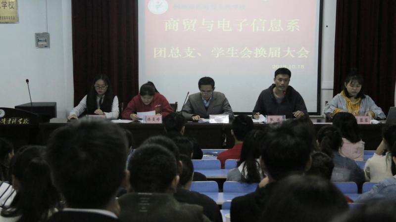 2018年10月18日19:30,商貿與電子信息係團總支學生會換屆大會在學生活動中心如期舉行。出席本次換屆大會的嘉賓有:商貿與電子信息係主任王煥庭,係團總支書記張波老師,上一屆學生會主席陳曼婷,新一屆學生會主席莫蓉蓉、團總支副書記劉利靜,以及各部門部長和成員。  本次換屆大會在張波老師的主持下拉開了帷幕。首先,張波老師介紹出席嘉賓,並簡單說明大會流程。接下來,上一屆學生會主席陳曼婷對去年工作進行總結,希望新主席團成員能夠“在其位,謀其政,擔其責”,並通過攜手合作,把學生會越辦越好。隨後,對上一年度團總支學生會優秀幹部及優秀學生成員進行表彰,並且由張波老師宣讀新一屆團總支學生會幹部名單。然後,由新一屆學生會主席莫蓉蓉發言,表示將付出更多努力,加強團總支學生會自身組織建設,做到模範帶頭作用,使新一屆團總支學生會綻放出更加奪目的光芒。 最後,王煥庭主任對本次換屆大會做了總結發言,希望新一屆學生會幹部能夠以身作則,樹立榜樣;希望新一屆學生會成員攜手合作,共同努力,繼續傳承我係優良傳統,讓商貿與電子信息係團總支學生會的工作更上一個台階。