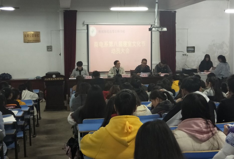 2018年11月14日晚7點半,由商電係團總支學生會舉辦的“第七屆寢室文化節”頒獎典禮和“第八屆寢室文化節”動員大會在學生活動中心召開,我係副主任王煥庭、徐偉,團總支書記張波,18級電子商務校企班輔導員方健等出席了本次會議。