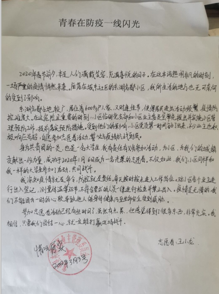 霍山雖然隻是縣城,卻也生活著36萬人。恰巧適逢佳節,人口流動較為密集,大大增加了病毒感染的可能性。作為家鄉的孩子,擁有共青團團員和大學生的身份,王小龍有責任和義務去幫助自己的家鄉,所以王小龍選擇成為小區的一名誌願者。從小事做起,從我做起。