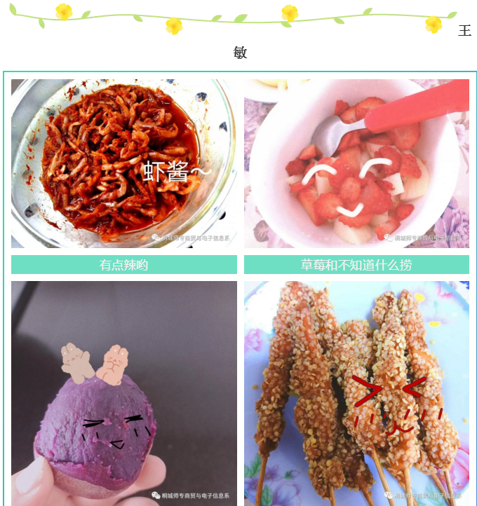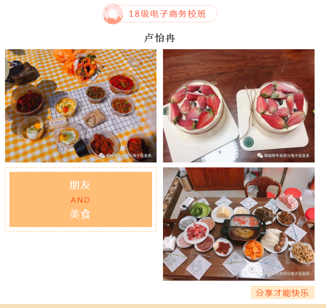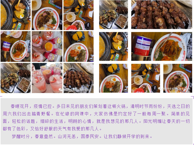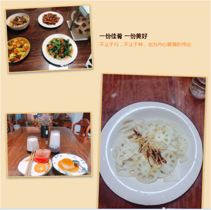 “庚子鼠年,卻不一般,疫情來襲,全民抗戰。”2020年突如其來的一場疫情,打亂了全中國14億人的生活。不少同學已經顛覆了之前的作息習慣,陷入了一日複一日的惡性循環。因此,我係開展了“分享生活 拉近距離”的活動,分享自己的快樂的事。比如:曬曬自己的廚藝、幫助父母勞動的場景、曬曬自己在某處遇見的風景等等。分享好的生活習慣影響著每個同學的生活方式、行為規範、價值理念和理想信念。拉近关键词2彼此之間的距離,分享彼此快樂的事。