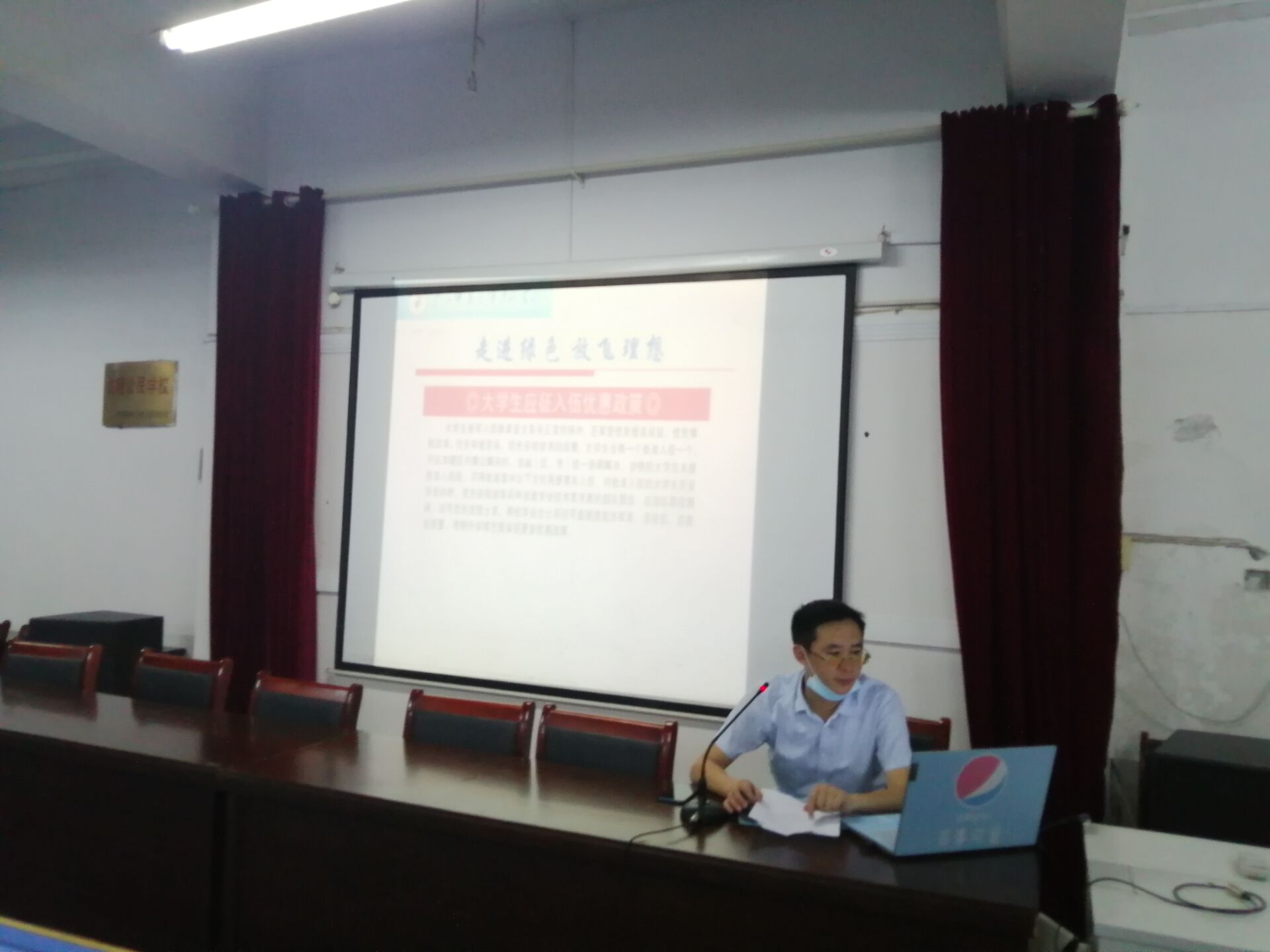 會議解讀了《2020年高校大學生參軍入伍服義務兵有關政策規定》,特別是對報名流程、身體條件、發展前途(專科學曆學生參軍退役並完成專科學業後,從2022年起,可免試入讀普通本科或成人本科)、經濟待遇等方麵做了重點宣講,鼓勵同學們要抓住機遇,積極響應國家號召,依法履行服兵役義務,攜筆從戎,在部隊中得到鍛煉和提高,為祖國和人民貢獻力量。