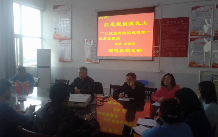 為充分發揮基層黨組織在疫情防控中的戰鬥保壘作用和黨員的先鋒模範作用,讓黨旗始終高高飄揚在疫情防控第一線。商電係黨支部書記蘇澤軍以“我是黨員我先上——讓黨旗在防控疫情鬥爭第一線高高飄揚”為主題,為支部全體黨員上了一堂充滿感染力和號召力的黨課,讓黨員心靈與思想又一次升華。