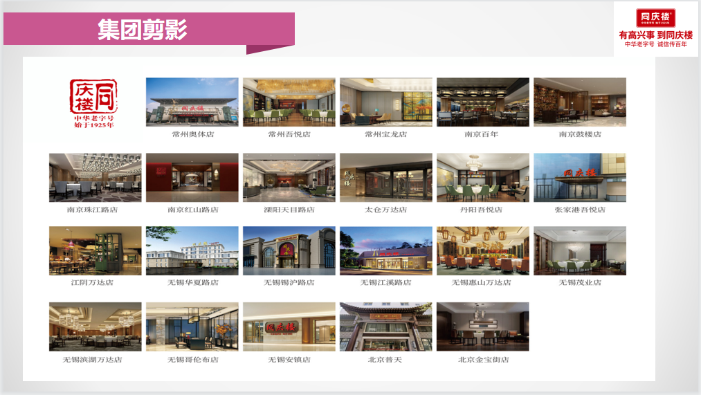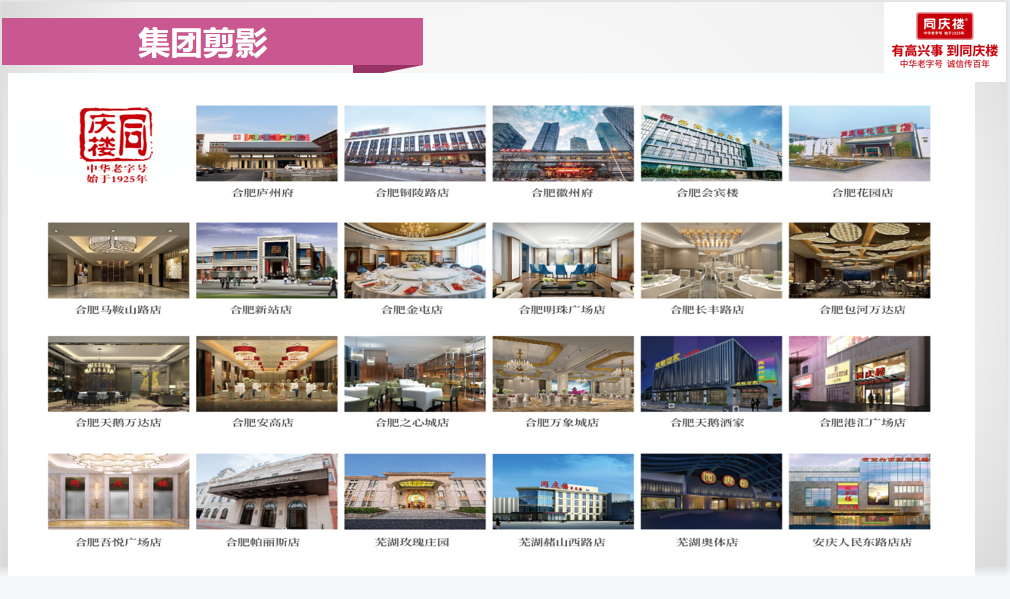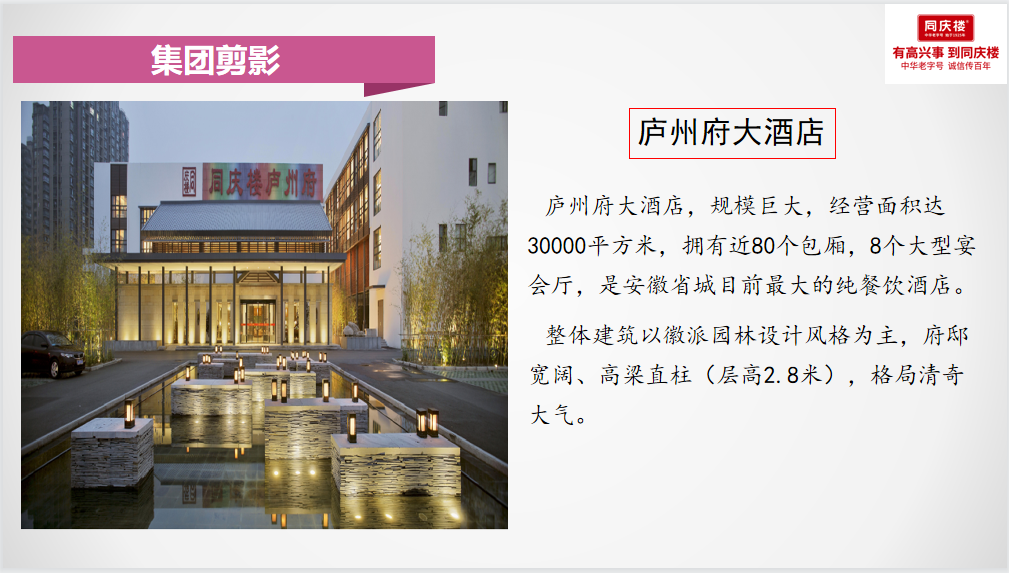 同慶樓創立於1925年,是國家正式認定的中華老字號餐飲企業,至今已有近百年的曆史,1999年被國家貿易部評定為首批中華老字號,2006年國家商務部再次認定同慶樓為中華老字號,2010年同慶樓作為中國8大菜係的徽菜代表企業入駐上海世博會,2014年又被國家商標總局認定為“中國馳名商標”