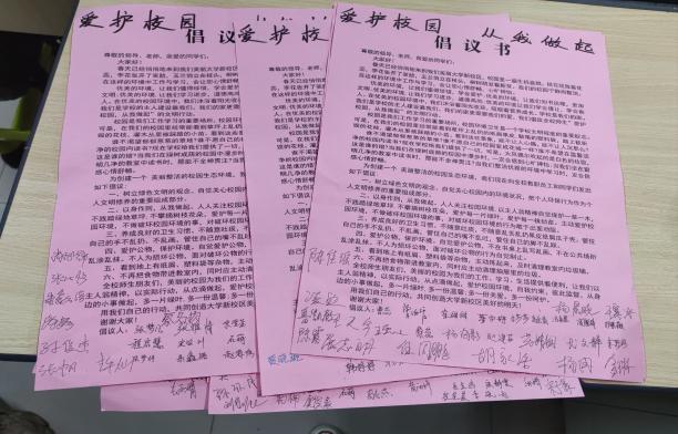 倡議的內容新校區建設中所存在的景觀建設及綠化等問題為背景,將校園草木損害、垃圾亂扔、草坪踐踏等現象的一些實物照片給予公布,以引起大家共鳴及重視。特此宣傳並倡導廣大學生愛護校園,愛護校園裏的一花一木,強化環保意識接著給同學們一份愛護校園倡議書並且簽字承諾以此來提高同學們對新校區環境衛生的重