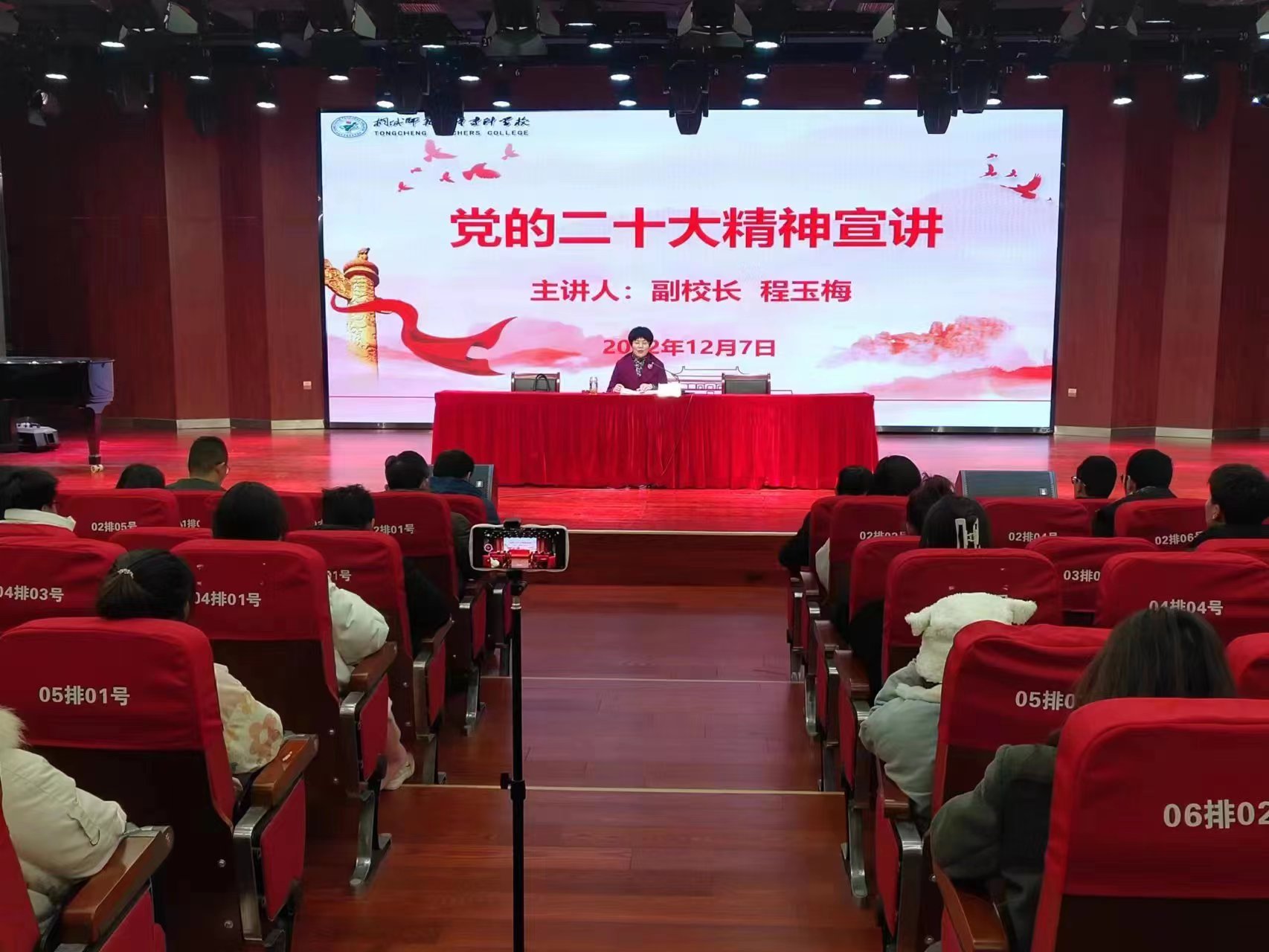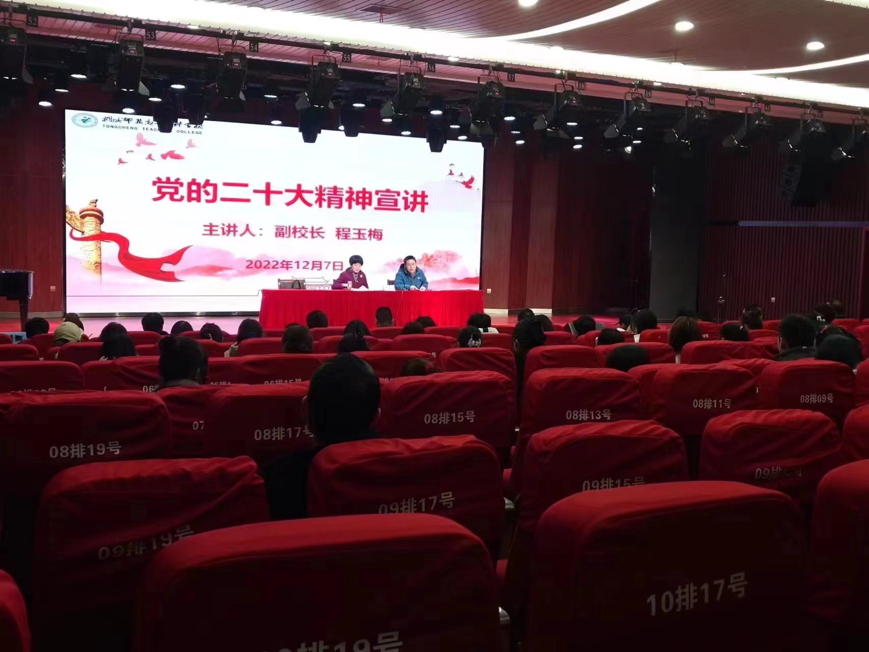 為進一步把黨的二十大精神學習宣傳貫徹工作引向深入,學到真處,落到實處,2022127日,校長程玉梅在音樂廳為商電係師生宣講黨的二十大精神,係全體職工、學生會幹部聆聽宣講。