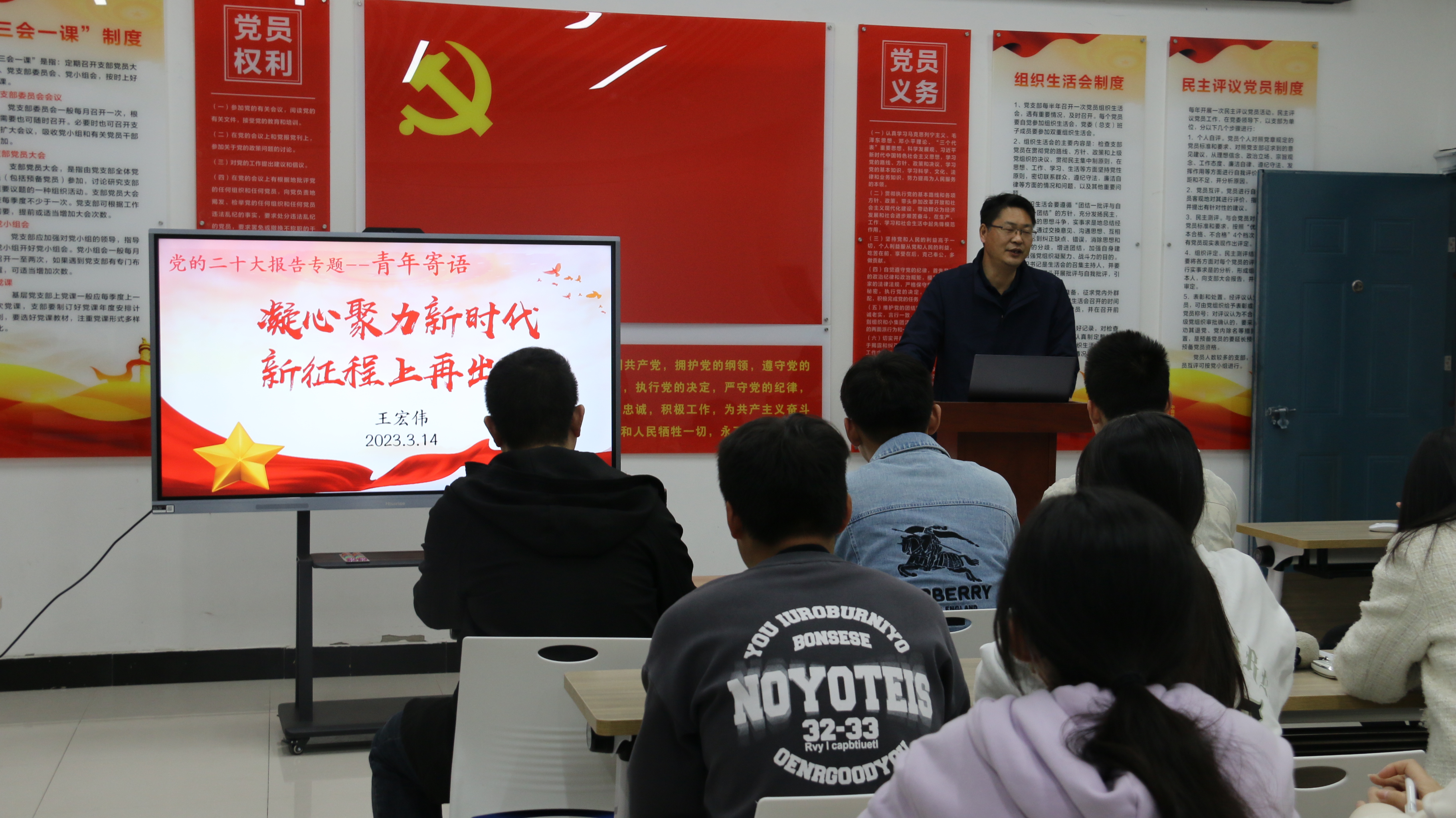 3月14日晚,校黨委委員、組織統戰部長王宏偉深入商電係“一站式”學生社區做了一場題為《凝心聚力新時代、新征程上再出發》的講座,同學生麵對麵座談、交流黨的二十大精神。